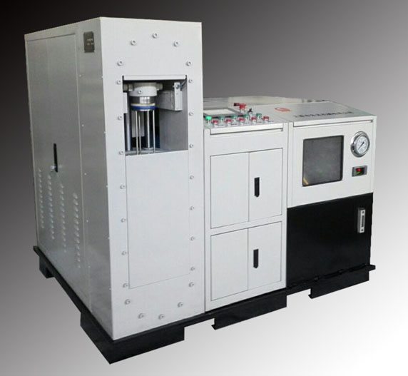 該機型是將上述幾部分合理組合于一起后外加機箱罩蓋而成為一體的機型。擺放在實驗室內彰顯整潔美觀和大方。該機工作腔壓蓋為垂直升降開閉式,其壓蓋內設排氣和應急(安全)卸壓裝置;框架固定在底板上,工作缸固定于框架內。增壓采用一次增壓完成式增壓器。控制系統采用PLC可編程控制器+觸摸屏顯示,可實現升壓分段自動控制和全程比例自動卸壓等操控形式。